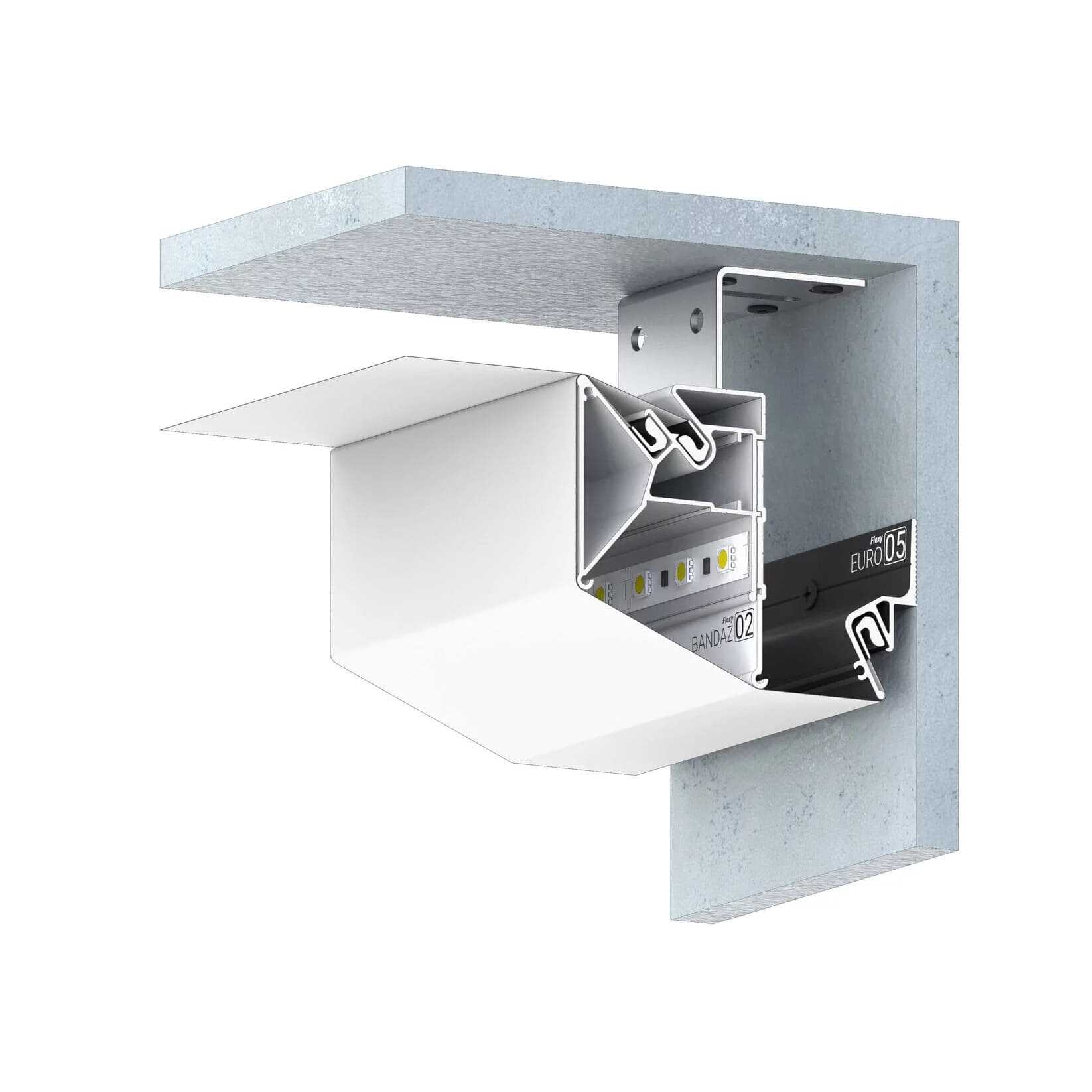 Профиль Flexy BANDAZ 02 предназначен для создания декоративной фаски и формирования ниш разной ширины для установки трекового освещения.