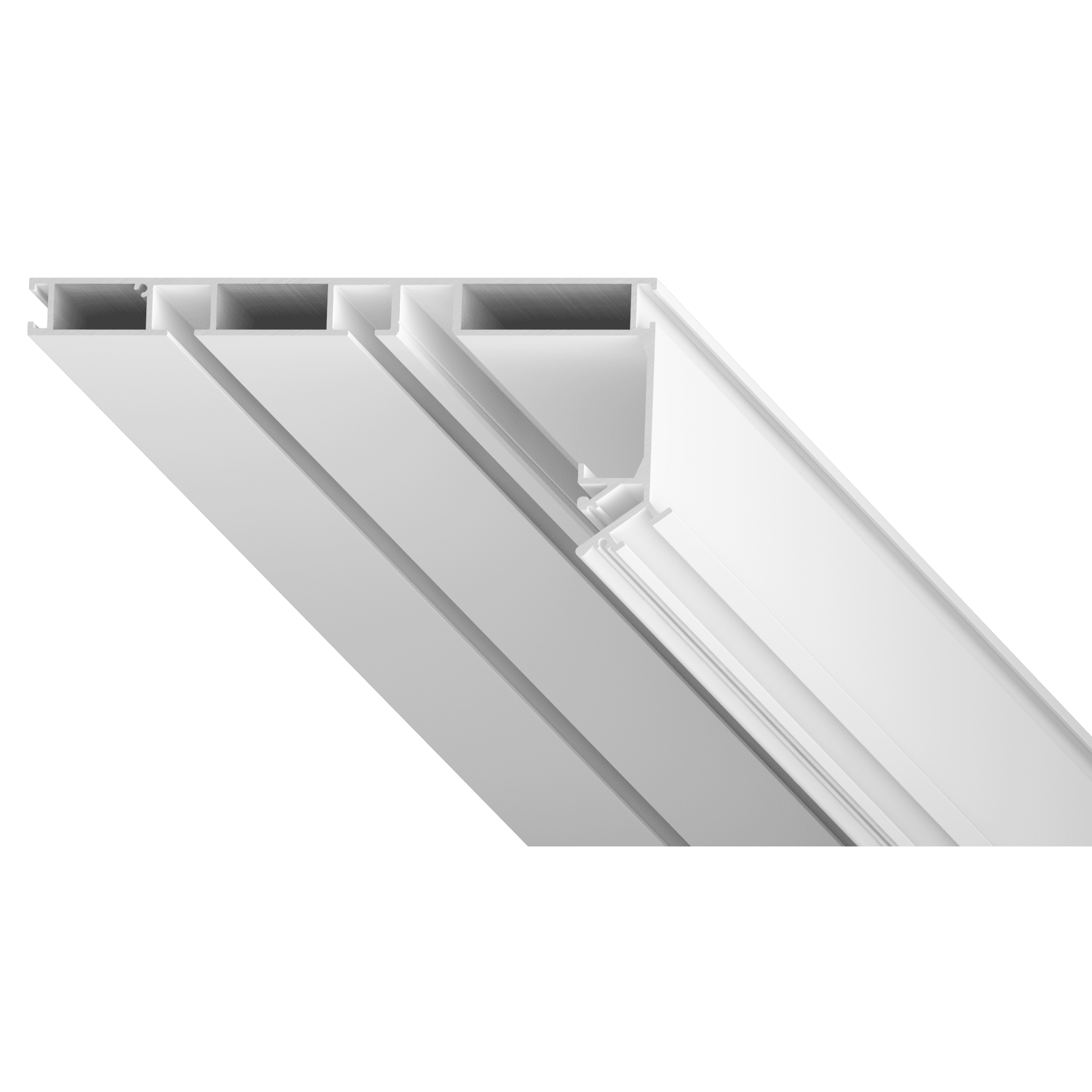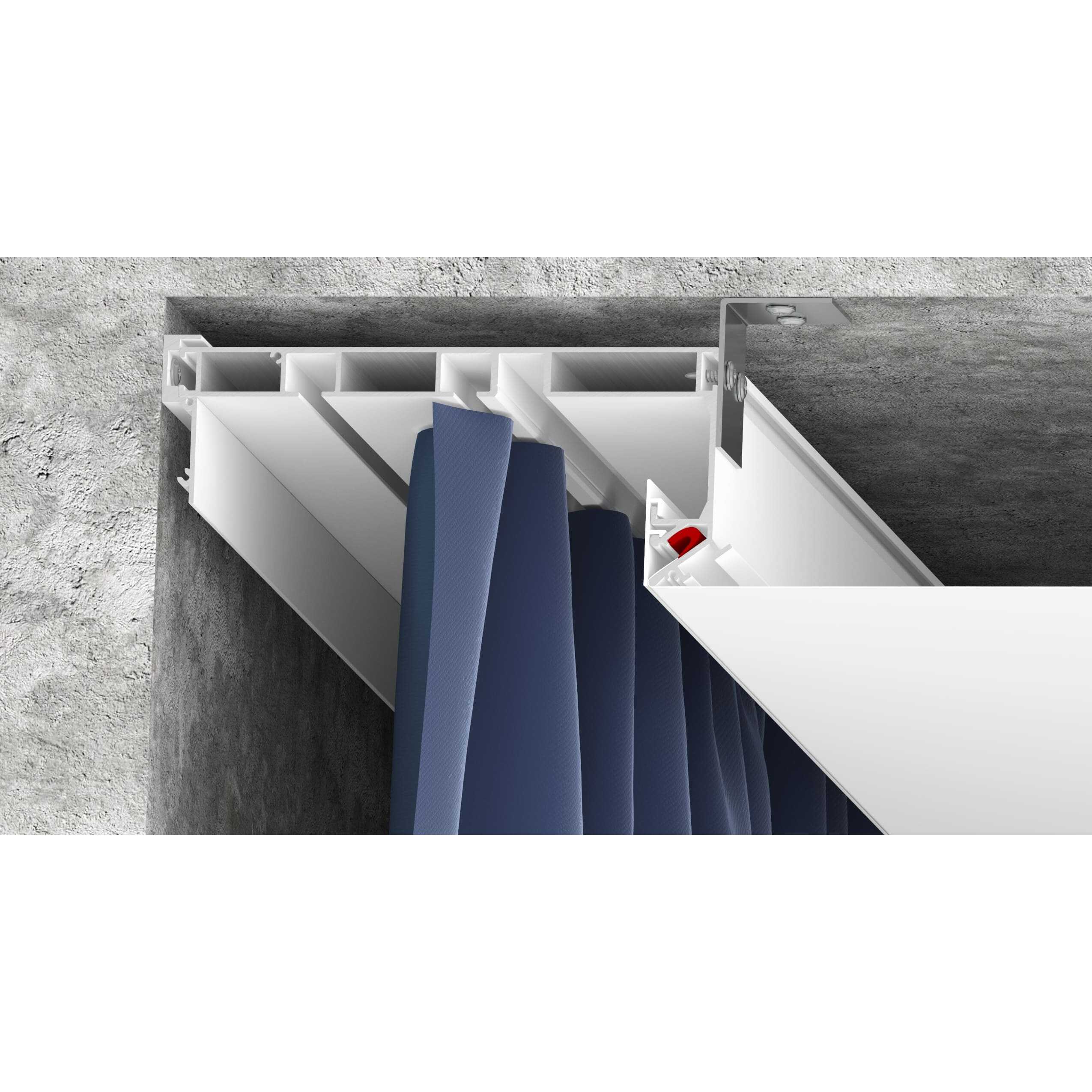 Скрытый карниз 03: Разновидность дизайнерского карниза, который устанавливается вплотную к стене. Он представляет собой цельнометаллический профиль белого или черного цвета с двумя рядами для крепления крючков. Карниз имеет оптимальную ширину для того, чтобы складки на шторах формировались правильно. Возможна установка светодиодной ленты для подсветки штор, которая направлена вертикально вниз и закрывается рассеивателем. Конструкция профиля предусматривает фиксацию полотна при помощи гарпунной системы крепления. Вертикальный паз для фиксации гарпуна закрывается маскирующей вставкой, алюминиевой или ПВХ.
